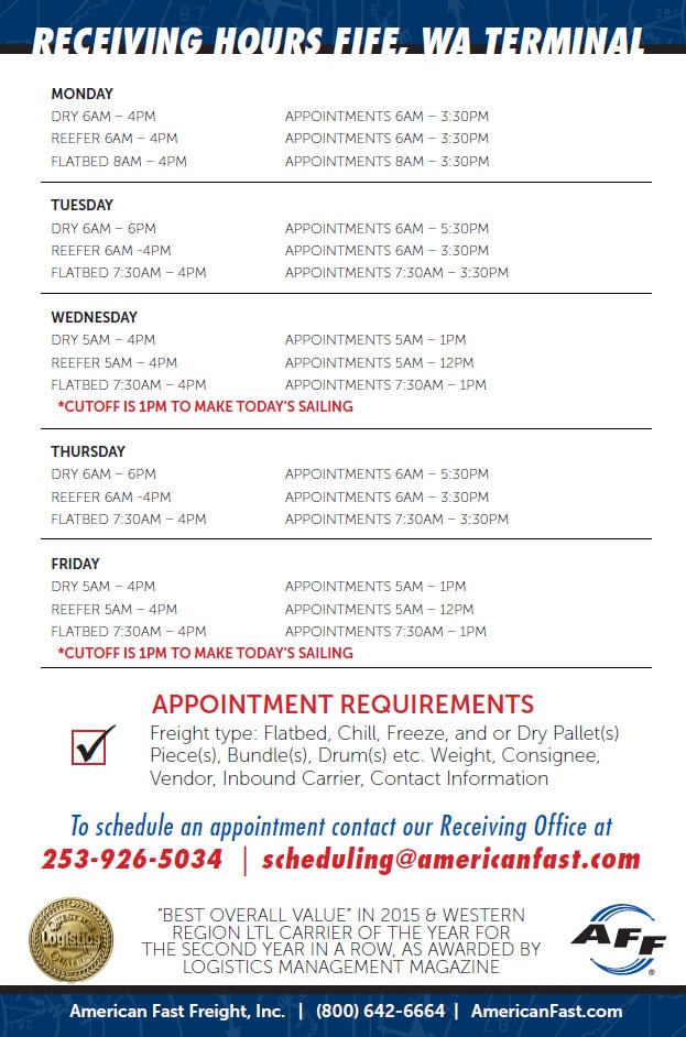 American Fast Freight has newly defined receiving and Appointment Scheduling Procedures Fife Terminal in Fife, WA. Please see our instructions below.